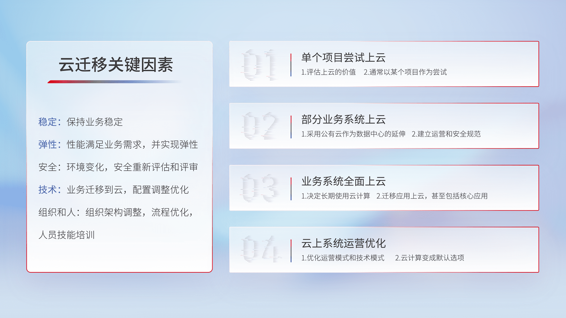 结合实际业务,,从规划设计、、、、云平台选型、、、云原生改造、、、数据迁移、、、集成交付,,迁移全过程为客户识别最佳上云路径,,,,做好风险识别管理,,,,设计网络架构、、、、身份权限、、、安全审计合规、、、操作审计、、、、日志审计、、、监控告警策略、、、多站点容灾设计等,,,,对云上基础设施进行整体规划,,提升IT治理水平,,以满足弹性、、高可用、、、高性能的需求。。