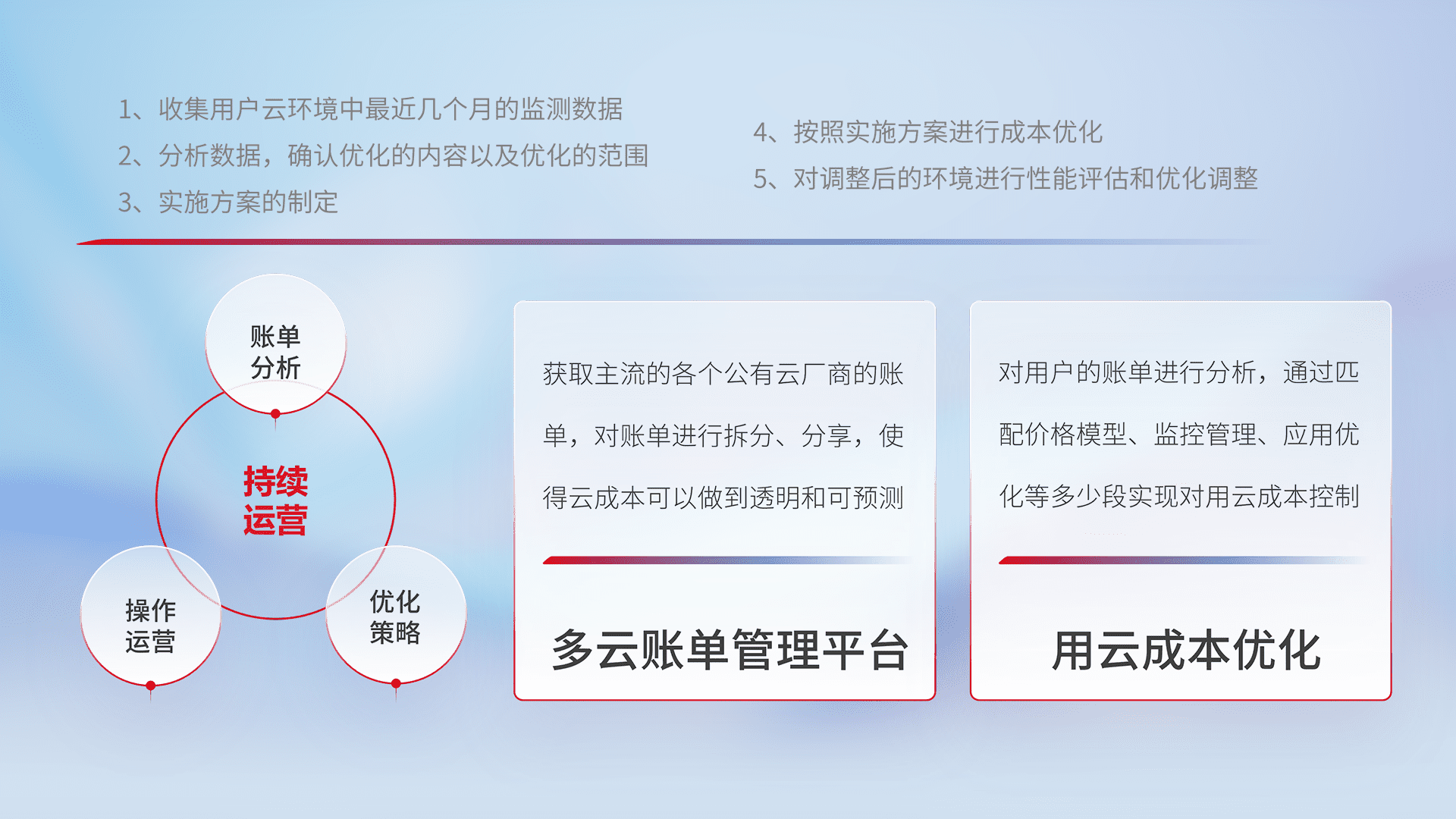 通过多云纳管,,,以统一的资源数据模型把客户的云资源进行抽象和封装,,,进而实现对多云资源的统一操作,,保障云资源管理的可靠性、、稳定性与可用性。。量身定制化运维内容,,,配置、、开发运维、、补丁管理、、、备份、、、、监控、、、、认证和访问管理、、、审计和日常巡检等,,保障在用云过程中的可靠度,,稳定度以及高可用率。。